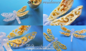 3. Layer filigree layer onto the Dragonfly base and apply Creative Medium using a palette knife.